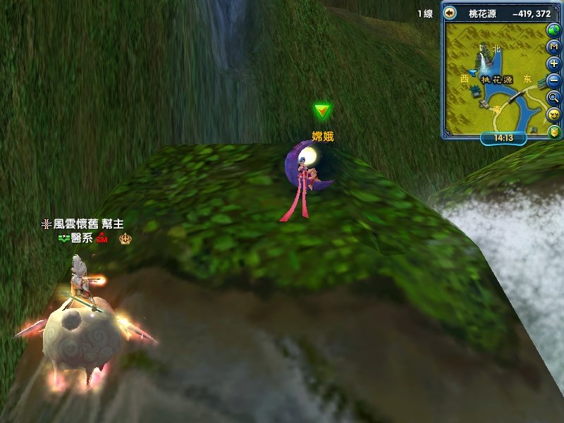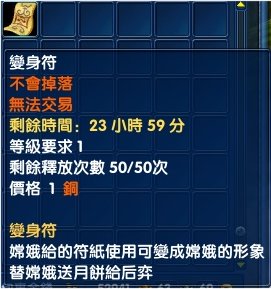 中秋節活動憑證於任務包包,憑該憑證參與活動。以下未特別註明者,每個任務每天可領取一次,最多可完成 5 次。 ★ 月宮仙子 上線自動接到一次,跟「月宮仙子」領取獎勵。 獎勵「女媧石」。 依性別獎勵「[時裝券] 中秋嬋娟如夢女裝(2021)」、「[時裝券] 中秋嬋娟如夢男裝(2021)」。 桃花源系列任務(一): ★ 中秋之玉兔大鬧桃源城 跟桃花源「后羿」領取任務。 ![]() 詢問「后羿」發生何事。 找「逍遙王爺張士誠」詢問仙藥的事。 ![]() 前往西南城門口 (-236, 335),消滅「玉兔精」。 ![]() 打死後玉兔原形現身,找「打回原形的玉兔」回覆。 若他人擊殺了,直接找「打回原形的玉兔」回覆。 ![]() 獎勵「珍藏月餅」。 隨機獎勵「[時裝券] 真·凌江袍·承鴛」、「開天符」、「如意令」、「女媧石」。 ★「中秋之嫦娥的思念」 續前面,憑「打回原形的玉兔」跟「逍遙王爺張士誠」領取任務。 從逍遙王爺張士誠那裡打聽仙藥的事,獎勵飛行座騎。 要求前往桃源瀑布的源頭處尋找「嫦娥」,嫦娥位於桃花源西北 (-427, 382) 半山腰上。 ![]() 收集 3 個蟠桃給嫦娥做月餅,蟠桃可用棒子從半空中的「蟠桃樹」上打下來。 ![]() 獎勵「月餅」、「變身符」,用於後續任務。 ★「中秋之千里共嬋娟」 續前面,使用「變身符」變身。 ![]() 右上獲得 Buff 情況下憑「月餅」跟「后羿」領取任務。 ![]() 繳回月餅即完成。 獎勵「珍藏月餅」、「女媧石」、「◇元寶券」。 隨機獎勵「白兔」、「[稱號券] 欲把相思說似誰」、「混沌符」、「十六階天成符」、「十六階至尊完璧符」。 依性別隨機獎勵「[時裝券] 明月金秋女裝(2020)」、「[時裝券] 明月金秋男裝(2020)」。 桃花源系列任務(二): ★ 秋摘黃花釀酒濃 跟桃花源「嫦娥」領取任務。 ![]() 幫助嫦娥收集兩份桂花以便釀一些桂花酒。 「桂花樹」位於嫦娥所在偏東北石堆上 (-403, 410),另一處在山腳下石堆上 (-382, 404)。 ![]() ★「不知秋思落誰家」 續前面,跟桃花源「嫦娥」領取任務。 不分順序幫助嫦娥將釀好的桂花酒送給她的 3 位舊友。 1. 桃花源「大師孫祖磊」,位於清風渡東北方樓塔旁 (428, -133)。 ![]() 會詢問問題: 第 1 題答案: 2.(以這個遊戲的尿性,明顯是要讓我回答問題了。) 第 2 題答案: 2. 有。 第 3 題答案: 1. 紅白相間。 第 4 題答案: 4. 四娃。 答錯 5 分鐘後可重來。 2. 桃花源「桃源監察使原李羅」,於桃花源飄香田 (223, 65)。 ![]() 如下圖沿著藍色框線順時針繞圈圈: ![]() 3. 京城「惡少尹湘寧」 ![]() 會詢問問題: 第 1 題答案: 2. 好吧你快說是什麼問題,我還有很多事情要做。(忍) 第 2 題答案: 2. 一米四二 第 3 題答案: 3. 3 第 4 題答案: 1. 靜如處子,動如脫兔。 答錯 5 分鐘後可重來。 獎勵「珍藏月餅」、「女媧石」、「◇元寶券」。 隨機獎勵「黑兔」、「[稱號券] 山月不知心底事」、「混沌符」、「十六階天成符」、「十六階至尊完璧符」。 依性別隨機獎勵「[時裝券] 墨影時裝女裝·漣訣」、「[時裝券] 墨影時裝男裝·漣訣」。 月宮系列: ★「被打亂的祭月大典」 跟「月宮仙子」領取。 ![]() 依序完成子任務: ☆「尋祭品(一)」 與「鐵匠顧青鋒」對話。 ![]() ☆「尋祭品(二)」 與「裁縫林輕雪」對話。 ![]() ☆「尋祭品(三)」 與「[武林盟]白展堂」對話。 ![]() ☆「尋祭品(四)」 前往京城的東北角 (187, 346) ~ (199, 355) 查看。 ![]() 獎勵「[中秋]月宮胡餅」,後續回覆任務用。 ☆「跟蹤腳印」 與「大富豪“項鄒人”」對話。 ![]() ☆「尋寒瓜」 採集「土堆」。 ![]() 獎勵「[中秋]月宮寒瓜」,後續回覆任務用。 ☆「交回祭品」 收集道具: 「[中秋]月宮胡餅」x 1 「[中秋]月宮寒瓜」x 1 獎勵「女媧石」、「◇元寶券」。 隨機獎勵「兔子」、「混沌符」、「十六階天成符」、「十六階至尊完璧符」。 依性別隨機獎勵「[時裝券] 街頭拳手女裝(2023)」、「[時裝券] 街頭拳手男裝(2023)」。 ★「恢復實力」 跟「月宮仙子」領取。 前往草原疊翠嶺採集「月桂」 ![]() 完成後找「月宮仙子」回覆。 ★「鬥狗」 跟「月宮仙子」領取。 領取時發放「逗狗溜溜球」。 ![]() 前往京城南門擊殺 1 隻「巡邏天狗」 ![]() 天狗喊話「哈哈哈,等著被我的絕招打飛吧...」後,若右上沒 Buff 被天狗打到會被傳送到他處。 大致是天狗開始戰鬥 10 秒後會喊話,接著 3 秒後放大招。 一般擊殺 9 下後施放溜溜球,右上獲得 Buff 便可擋掉天狗大招,避免被傳送。 ![]() 完成後找「月宮仙子」回覆。 ★「打探」 跟「月宮仙子」領取。 領取時發放「變身“天狗”」。 ![]() 變身後前往京城南門找「天狗追蹤者」回覆。 ★「忘川村救月神!」 跟「月宮仙子」領取。 前往烙印擊殺 30 隻「小天狗」 ![]() ★「月神的獎賞」 跟「月神」領取。 ![]() 前面關卡擊殺「巡邏天狗」後「月神」會現身 30 分鐘。 若消失了重新擊殺「巡邏天狗」便會刷出。 獎勵「珍藏月餅」、「女媧石」、「◇元寶券」。 隨機獎勵「兔子座騎」、「[稱號券] 總是當時攜手處」、「混沌符」、「十六階天成符」、「十六階至尊完璧符」。 依性別隨機獎勵「[時裝券] 金葉飛舞女裝(2021)」、「[時裝券] 金葉飛舞男裝(2021)」。 懷舊活動: ★ 中秋節 跟八里「玲瓏」領取任務,活動期間可完成一次。 ![]() 稍候片刻自動完成。 獎勵「珍藏月餅」、「女媧石」。 ★ 水調歌頭 跟京城「蘇小小