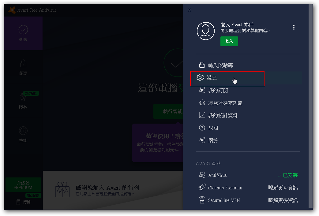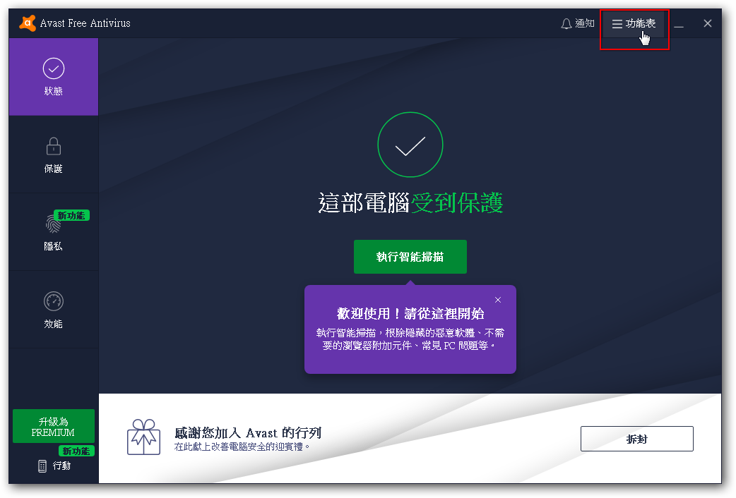 1. 按兩下桌面「Avast」圖示或按右下「常駐程式」開啟防毒軟體。