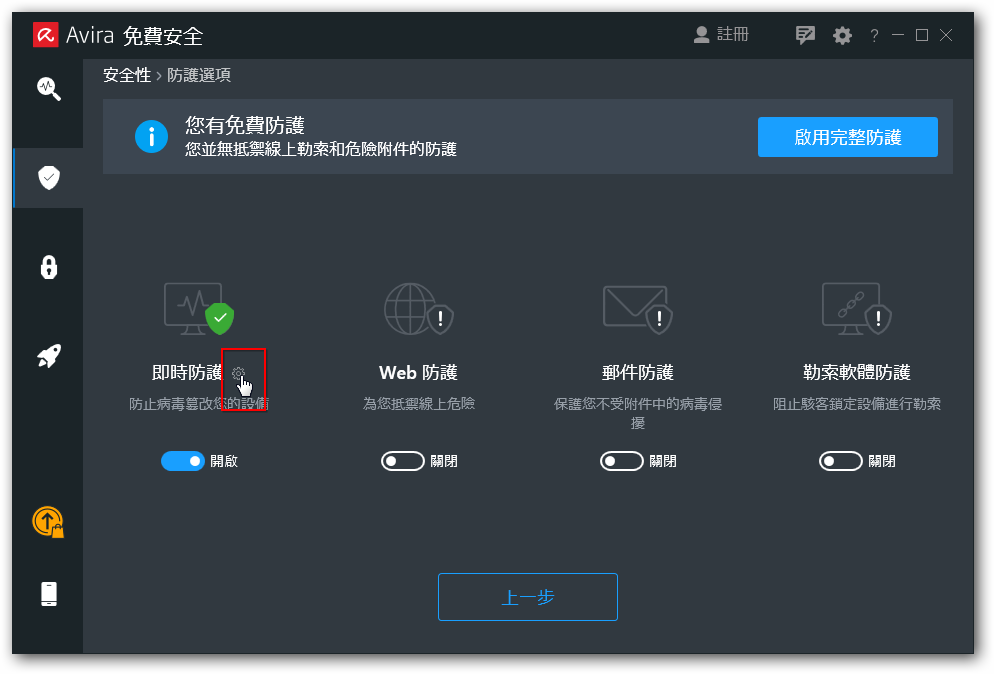 3. 按「即時防護」旁邊「小齒輪」開啟設定介面。