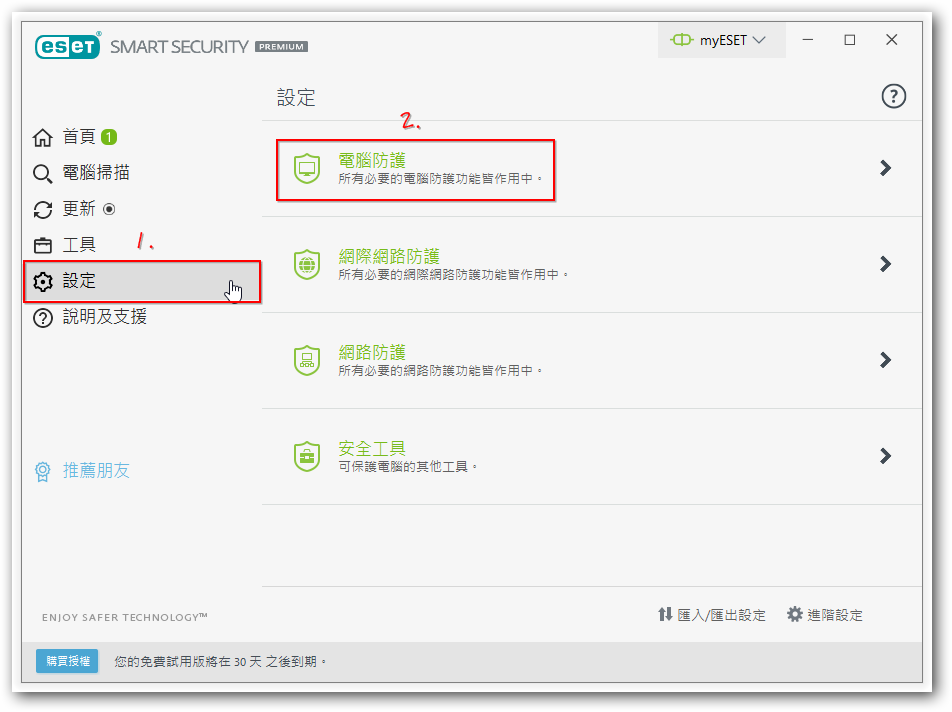 1. 按兩下桌面「ESET」圖示或按右下「常駐程式」開啟防毒軟體。