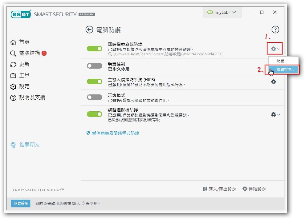 3. 按「即時檔案系統防護」右側「齒輪」彈出選單,再選「編輯排除」。