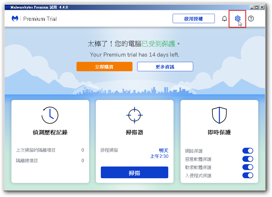 1. 按兩下桌面「Malwarebytes」圖示或按右下「常駐程式」開啟防毒軟體。