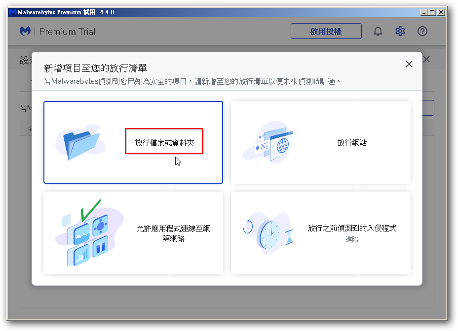 4. 選擇「放行檔案或資料夾」彈出新增檔案對話。