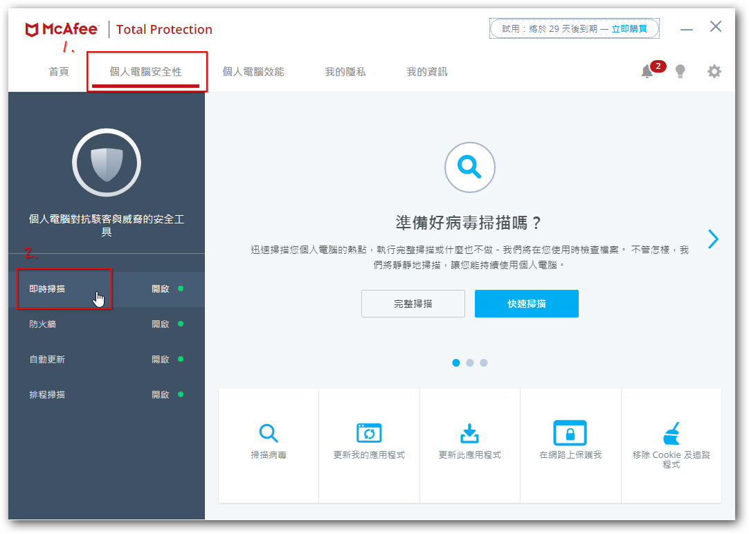 1. 按兩下桌面「McAfee」圖示或右下「常駐程式」開啟防毒軟體。