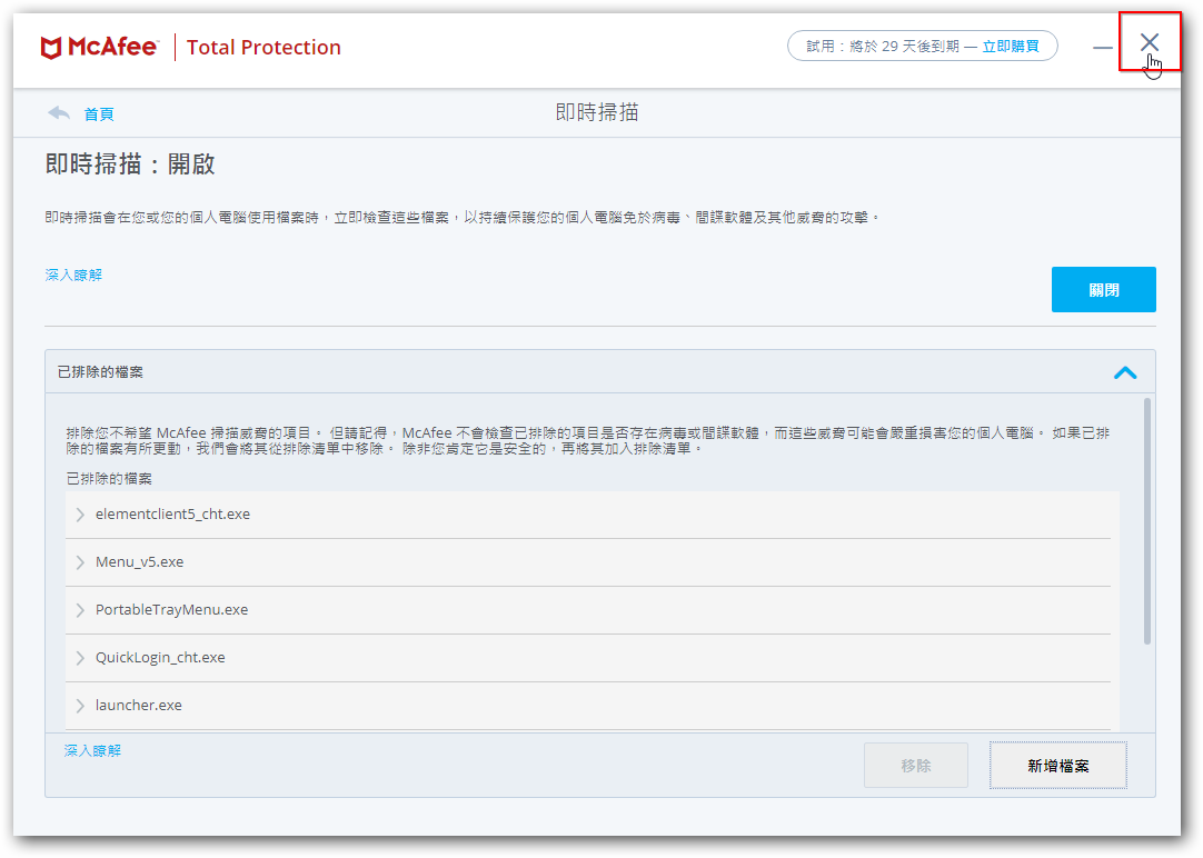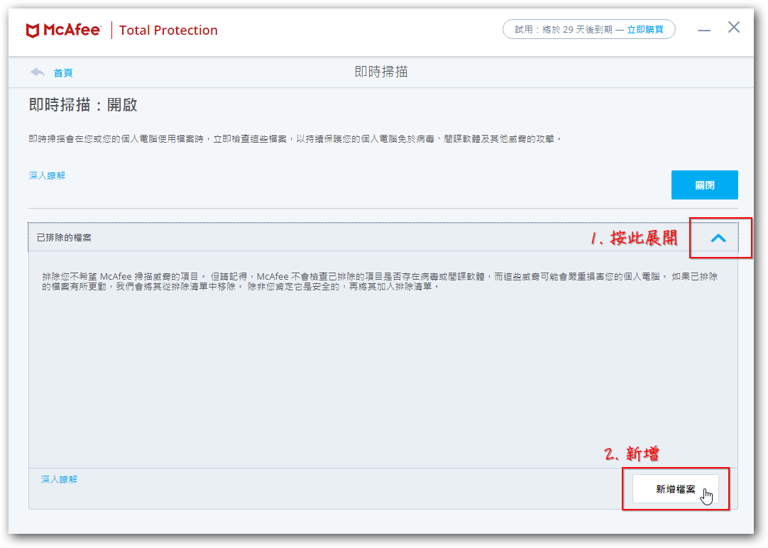 3. 按「已排除的檔案」最右邊「Ⅴ」鍵展開清單,再按最下面「新增檔案」。