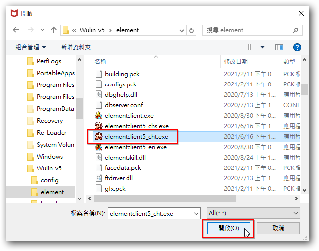 4. 選擇「武林主程式」並按「開啟」鍵返回上一頁。elementclient5_cht.exe 繁體版,結尾 chs 簡體版。