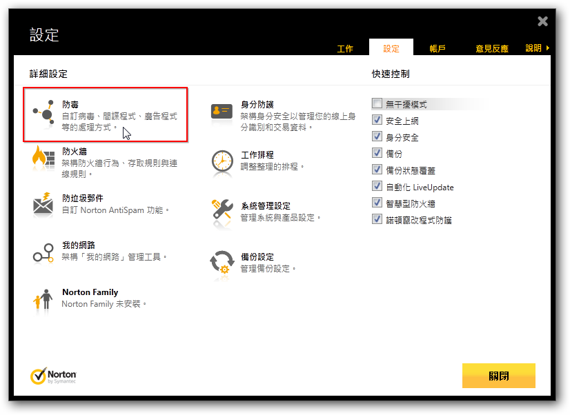 1. 按兩下桌面「Norton」圖示或按右下「常駐程式」開啟防毒軟體。
