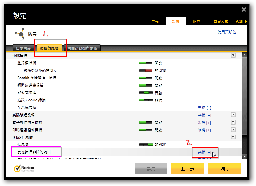 4. 於「掃瞄與風險」頁籤,按「要從掃瞄排除的項目」右側「架構」彈出排除對話。