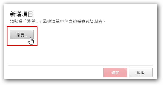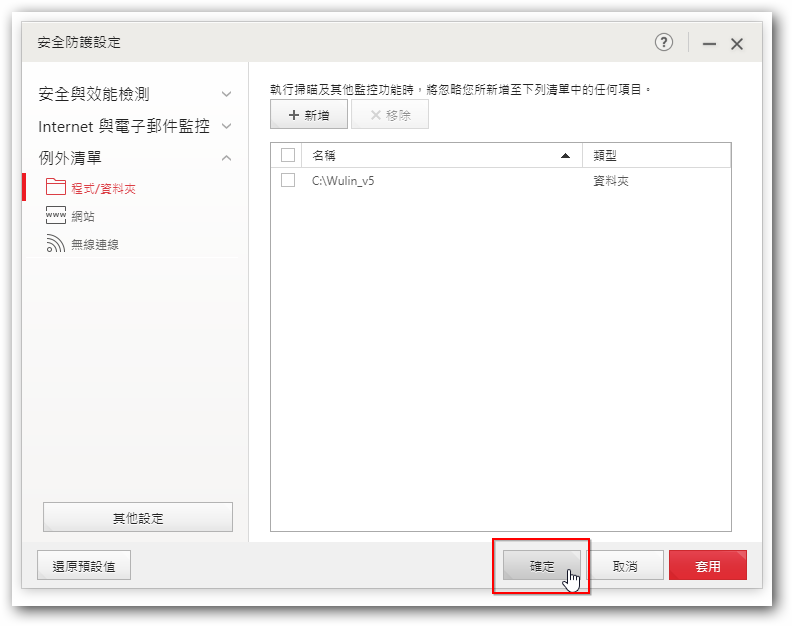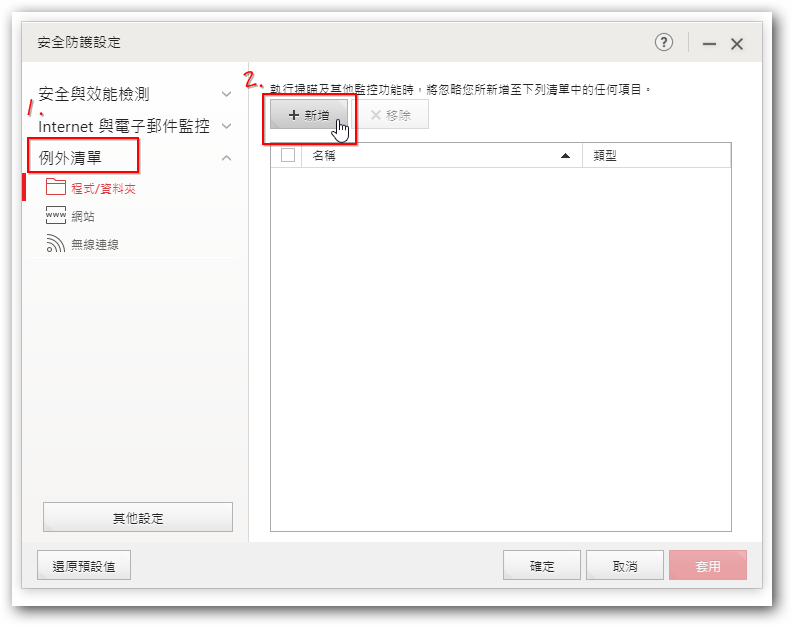 3. 於「例外清單」頁籤,預設「程式資料夾」項目裡,按右側「新增」鍵開啟新增對話。