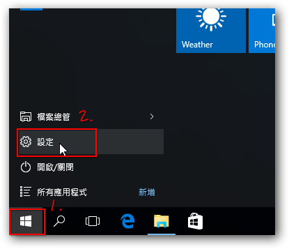 1. 按左下「開始」圖示再按「設定」開啟系統設定。