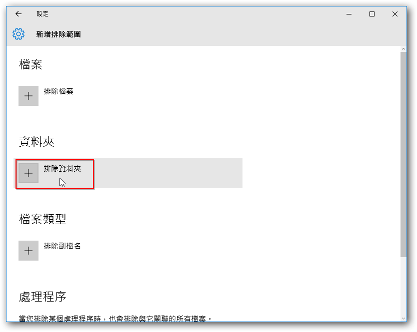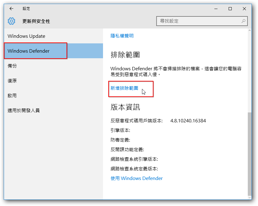 3. 於「Windows Defender」頁籤裡選「新增排除範圍」。